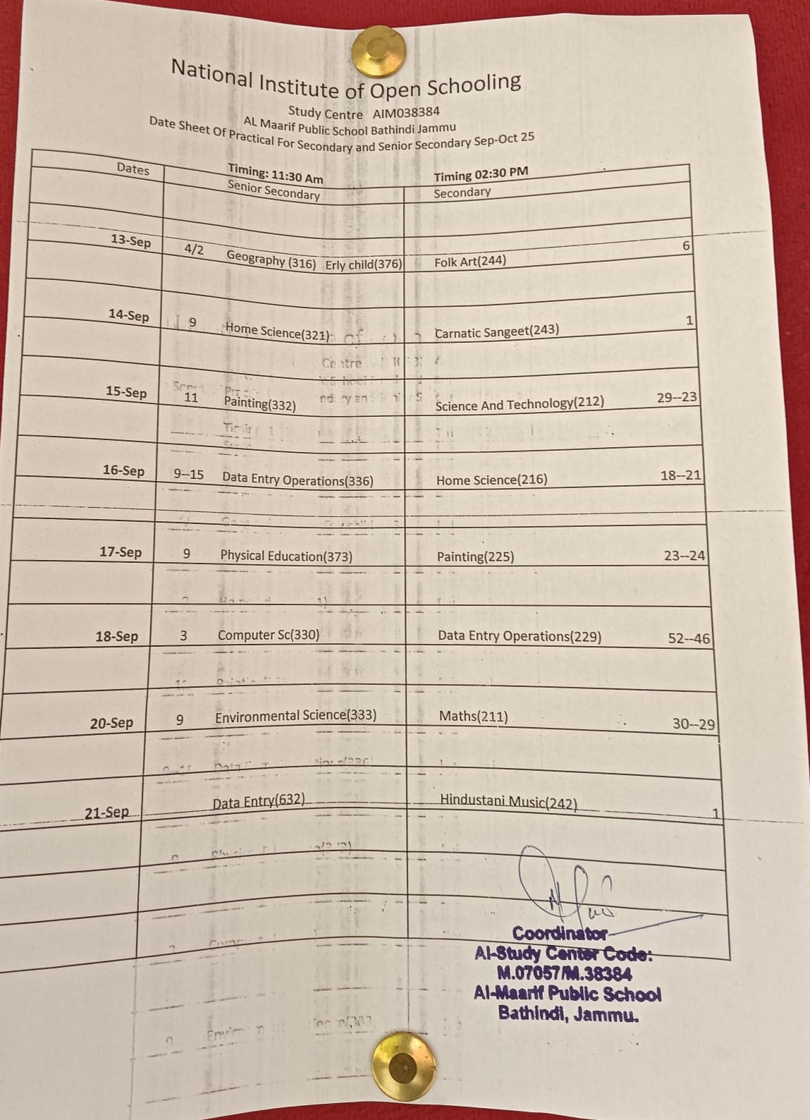 Examination Fee Payment schedule for Oct/Nov 2025 exams of Secondary and Senior Secondary courses (only for the learners who were registered for April/May 2025 exams) Jammu